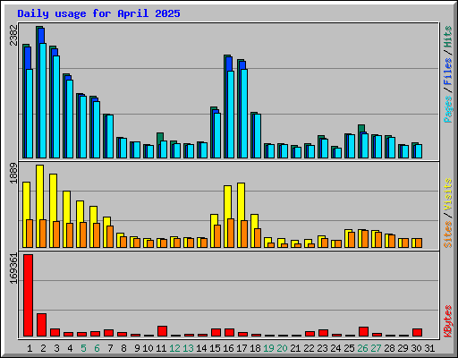 | Day | Hits | Files | Pages | Visits | Sites | KBytes | ||||||